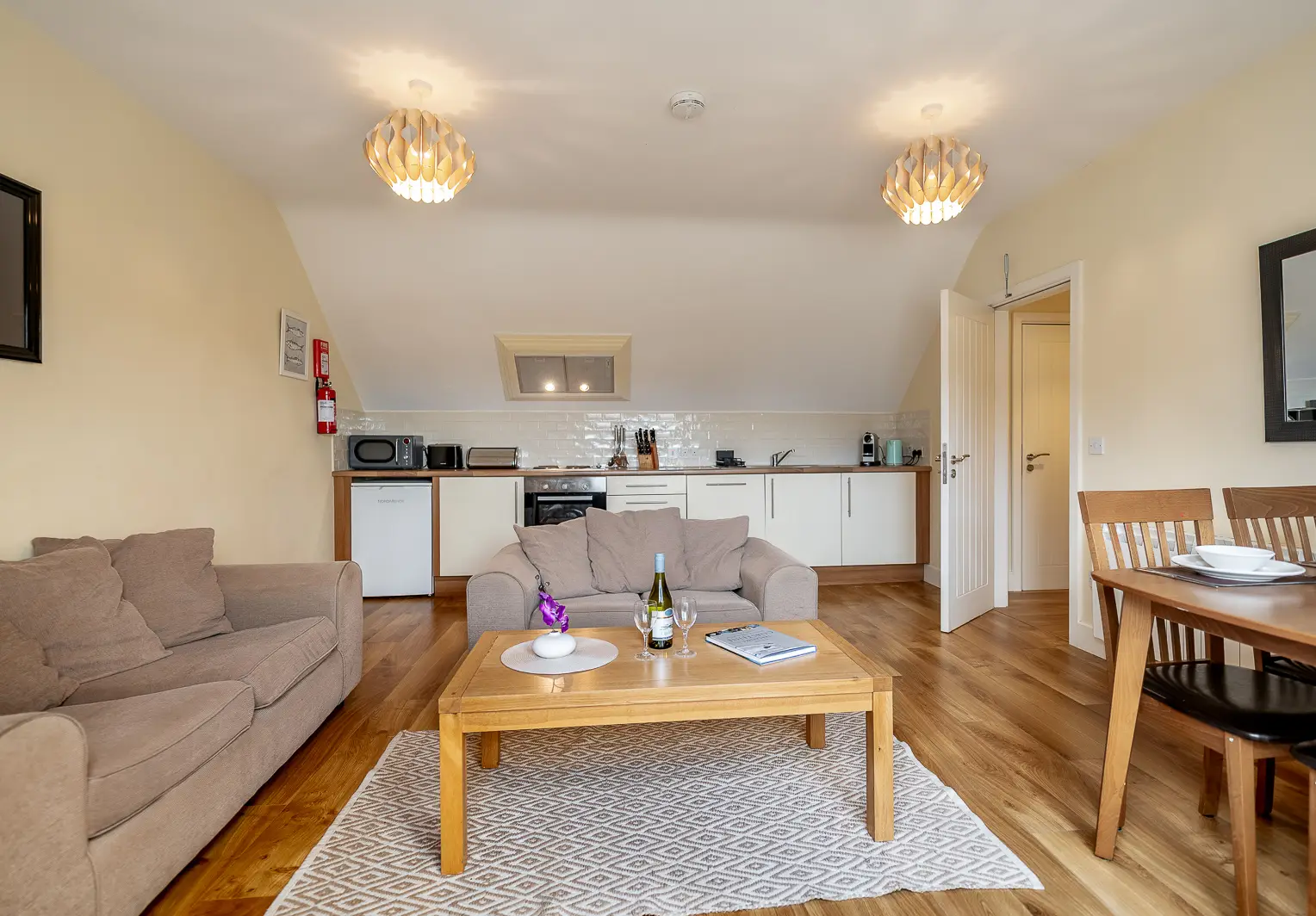 The open-plan living, dining and fully equipped kitchen area has everything you need for easy self-catering, plus fast Wi-Fi and cosy heating so you can relax after a day out. Plentyof natural light, and the apartment is on the upper floor, accessed by stairs.